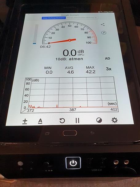 ![]() | Das gedämmte Bequiet Pure Base 600 Gehäuse bietet eine gute Basis. Leistungstechnisch muss man hier keinerlei Abstriche machen. Ganz in Ruhe lässt sich hier geschwind arbeiten. Im Normalbetrieb ist er, mit einer Tablett-App gemessenen Größe von 0,0 dB, ein lautloser Büro Power Rechner der nach Feierabend auch Mediacenter Qualitäten hat. Der Ninja 5 CPU Lüfter arbeitet Temperaturgesteuert. Die leisen Bequiet Gehäuse - Lüfter könnten manuell nachgeregelt werden. Selbst bei Übertaktung der CPU und voller Lüfter-Leistungsstufe bewegt er sich unter 10,0 dB. Standard Stufe 1 = 0,0 dB Mittlere Stufe 2 = 3,7 dB Power Stufe 3 = 9,6 dB |