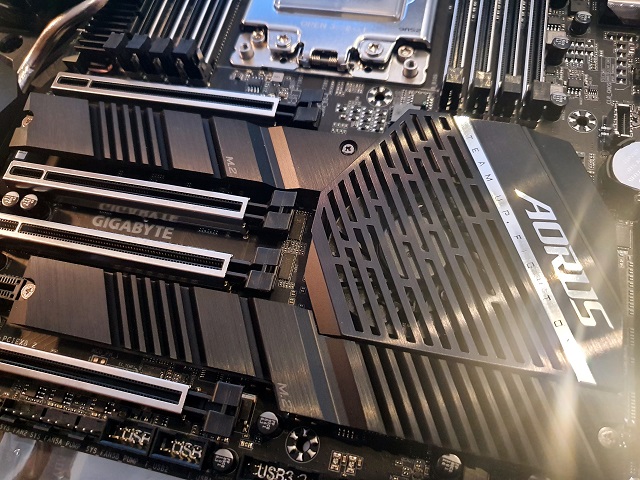 Chipsatzkühler mit den angebundenen M2 NVMe SSD Kühlprofilen. Insgesamt 3 M2 Steckplätze stehen zur Verfügung