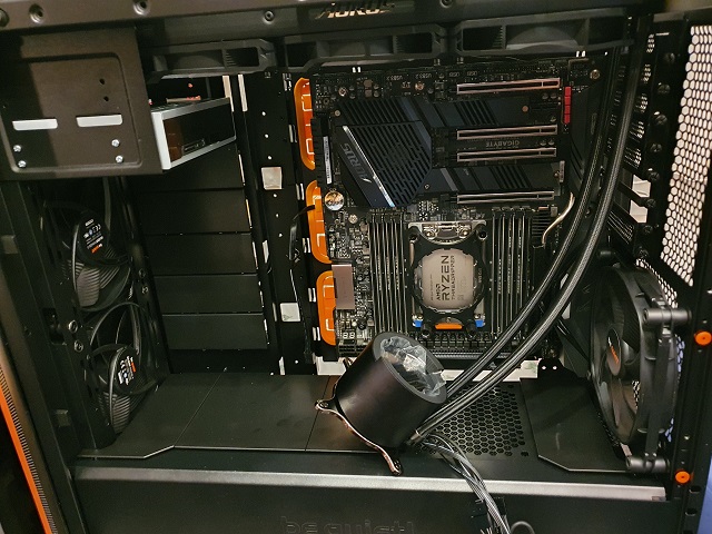 Das Bequiet Dark Base Pro 900 Rev.2 Gehäuse ist ein Qualitativ hochwertiges praktisches Gehäuse mit viel Konfigurations- und Umbau Potential. Das Aorus Master TRX40 EATX Mainboard nebst Aorus Liquide Cooler 360 passt gut rein. Das Netzteil ist nun auch platziert. Die Netzteilabdeckung ist gut Modular aufgebaut und bietet einige Optionen für den Einbau zusätzlicher Lüfter oder einer gut sichtbar platzierten SSD, aber etwas fummelig beim Einbau. Auch fehlt eine Aussparung, wenn man die beiden im Lieferumfang enthaltenden LED Stripes verwendet. Nach dem einkleben kann man die Netzteilabdeckung nicht mehr wegnehmen ohne die LED Leiste wieder abzureißen. Hier vorher Aussparung nach/einarbeiten. Die Lüfter sind sehr Leise und der Airflow ist optimal, da man nicht benötigte Laufwerksschächte weglassen kann. Einfach zugängliche Filtereinsätze vorn und unten erleichtern die Wartung. Einfach herausnehmen und unter dem Wasser reinigen. Es bietet viele Praktische Anschlüsse neben dem Powerknopf wie Micro, Kopfhörer, 2x USB 3.0, 1x USB 3.2 Type C, nebst USB Ladebuche und Qi induktiver Handyladeablage. Ich habe auch schon das Dark Base 900 und 600 verbaut, aber das Pro 900 Rev.2 ist mein Favorit, zumal ich einige Komponenten mit RGB verbaut habe und die erst durch das große Temperglasfenster so richtig zur Geltung kommen.